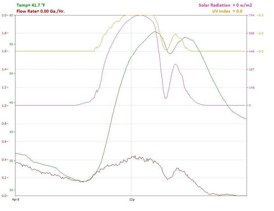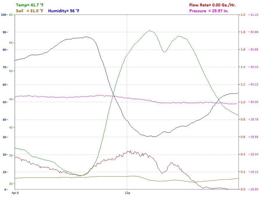 Looking at Figure 1, the dark brown curve shows the flow rate of sap over the entire day of April 8. As you can see, sap was running of April 7 and slowed down overnight, but since it didn’t freeze it didn’t stop running. Once the sun rose and things started warming up the flow increased gradually. The solar eclipse reached totality around 2pm and you can clearly see the impact on temperature [the green curve]. The eclipse begins around 1pm where you can see the temperature begin to fall, bottoming out a peak and then increasing again as the eclipse ends. The total temperature drop was about 5 degrees, which doesn’t seem like much, but if you were there you would think it got much colder, more on this later. Looking back to the sap flow, you can see that for one tap in a tree, the peak flow rate was about 0.4 gallons of sap per hour, not great, but very good. At the peak of the eclipse, this flow rate was essentially cut in half, which is very substantial. If you look around 9am, you can see the temperature is around 32F and flow rate is about 0.2 gallons per hour. This amount doubles [similar to what happens during the eclipse] before noon, when the temperature changed about 20 degrees, not the 5 degrees during the eclipse. Are there other things going on? Let’s take a look at figure 2…